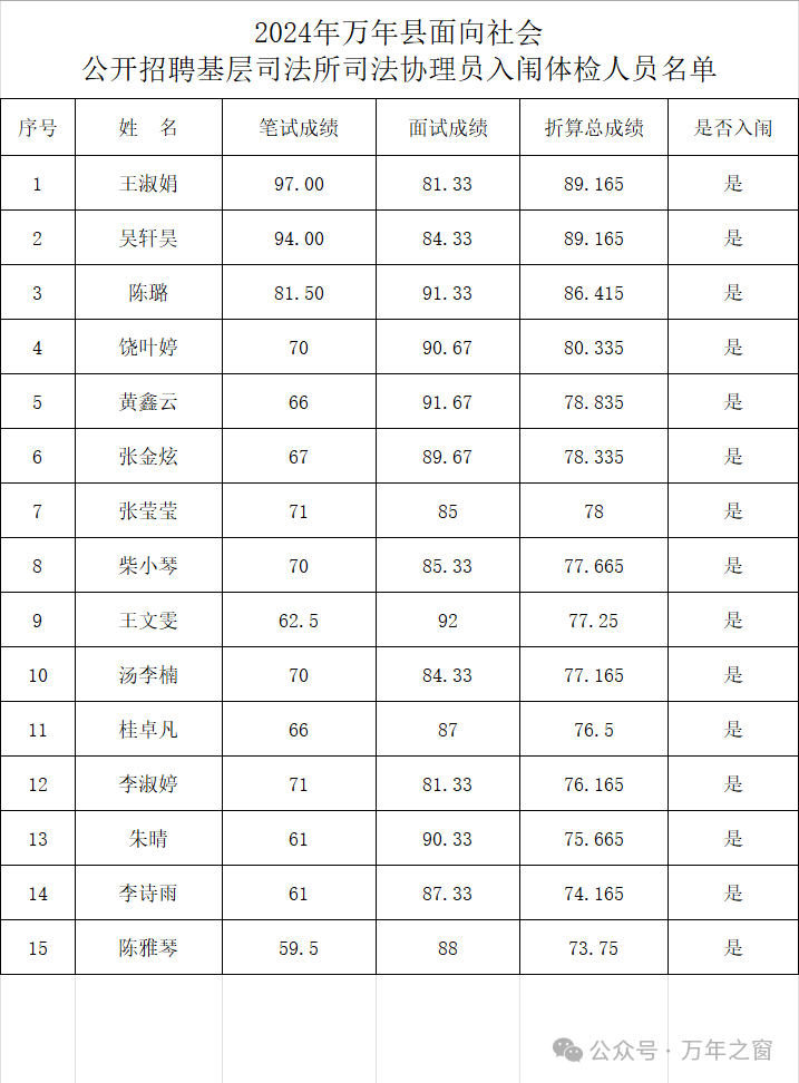 2024年万年县面向社会公开招聘基层司法所司法协理员总成绩及入闱体检人员名单公示根据《2024年万年县面向社会公开招聘基层司法所司法协理员公告》有关规定,现将考生笔试、面试总成绩及入闱体检人员名单予以