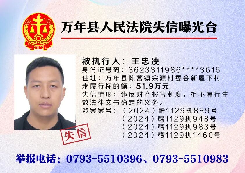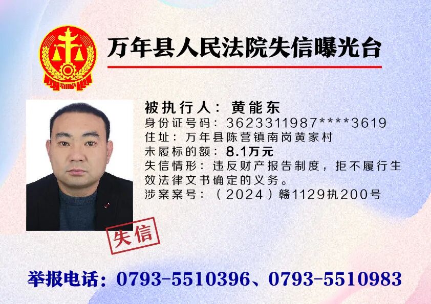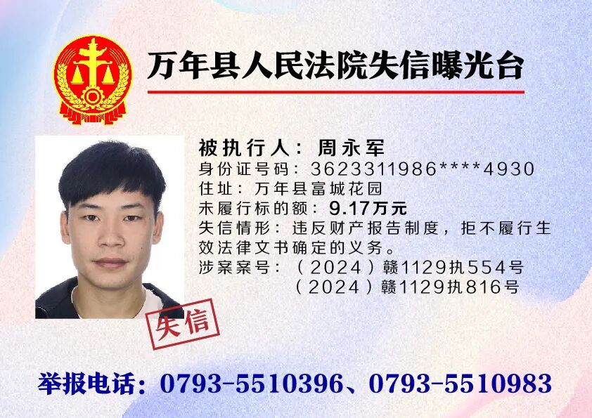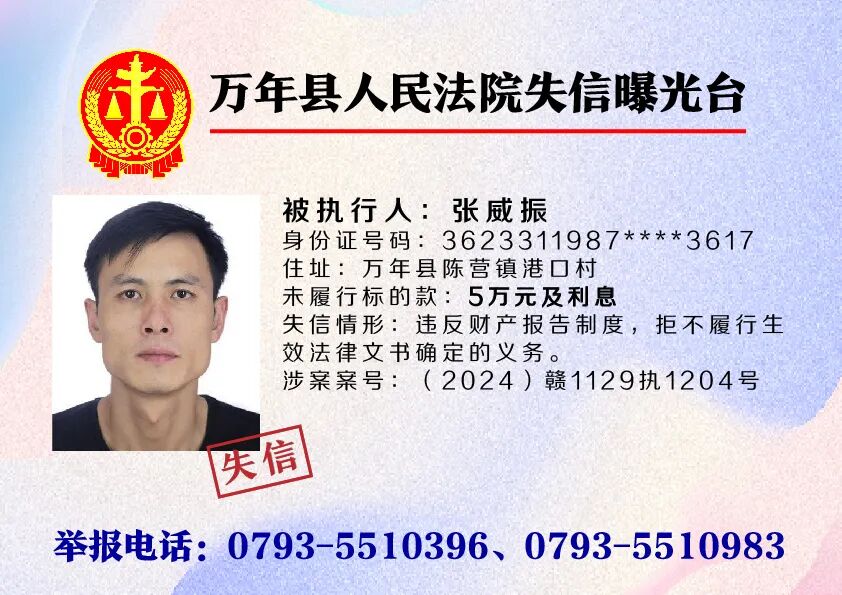 为切实保护申请执行人的合法权益,促使被执行人自觉履行生效法律文书确定的义务,推进社会信用体系建设,维护司法权威,根据《最高人民法院关于公布失信被执行人名单信息的若干规定》的相关规定,经依法审查,现万年