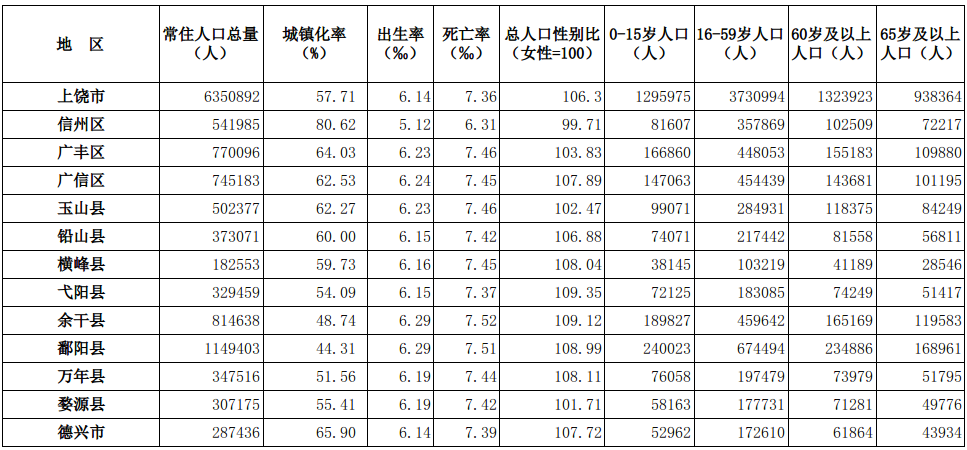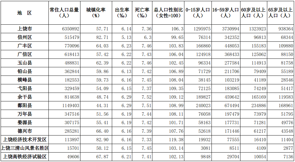 按照国家统计局、江西省统计局统一部署,2024年上饶市人口变动抽样调查采取多阶段、分层、概率比例的抽样方法,全市共抽取336个村级单位为调查样本,调查人口约5万人。现将根据人口变动抽样调查数据推算的全